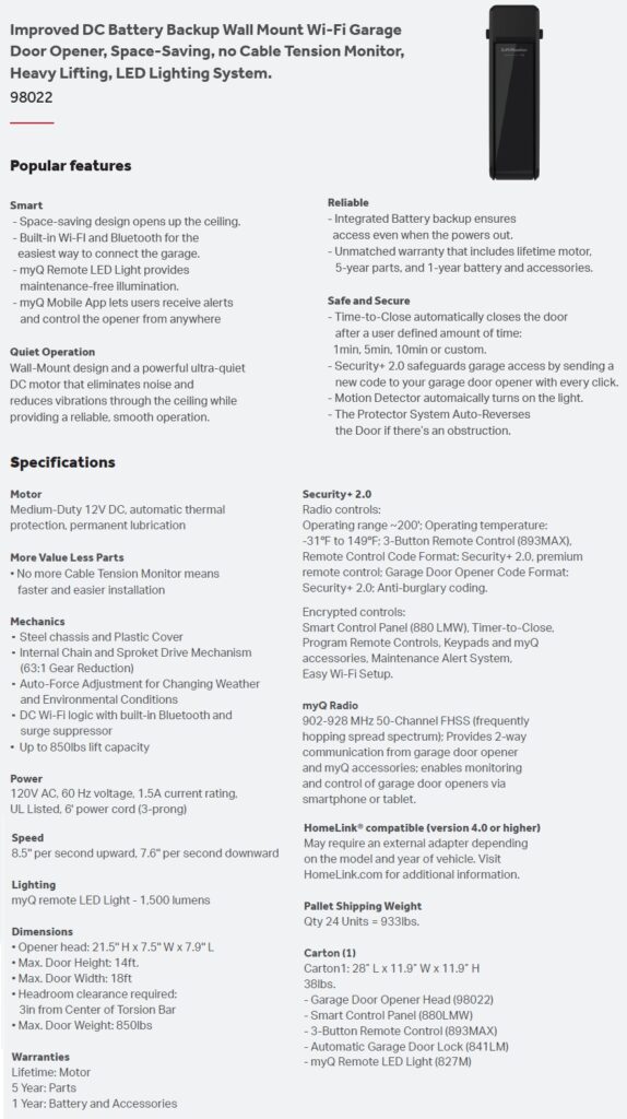 With the 98022 LiftMaster has, mercifully, done away with the cable tension monitor from earlier models — this annoying device was the biggest source of reliability problems on the earlier 8500w and 3800 models.